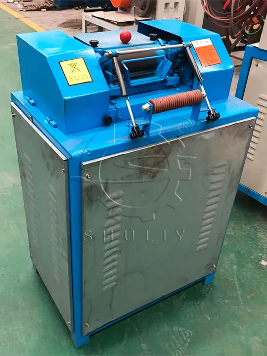 Diese Maschine besteht aus zwei oberen Walzen und einer unteren Walze. Die obere Walze hat zwei Materialien: eine Gummiwalze und eine Eisenwalze. Die untere Walze hat nur eine Eisenwalze. Im Allgemeinen ist die Lebensdauer der Gummiwalze kurz, aber sie wird den gebildeten Kunststoffstreifen nicht zerbrechen.
